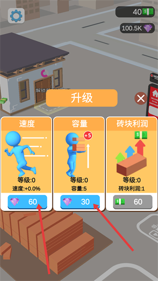4、可對速度、容量、磚塊利潤進行升級,消耗鉆石或金幣提升這些屬性,讓角色搬運磚塊更快、一次搬運更多、每塊磚收益更高。