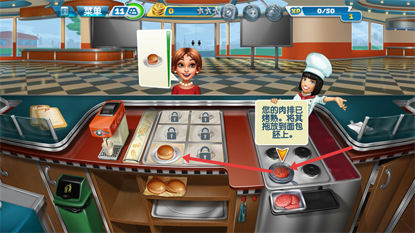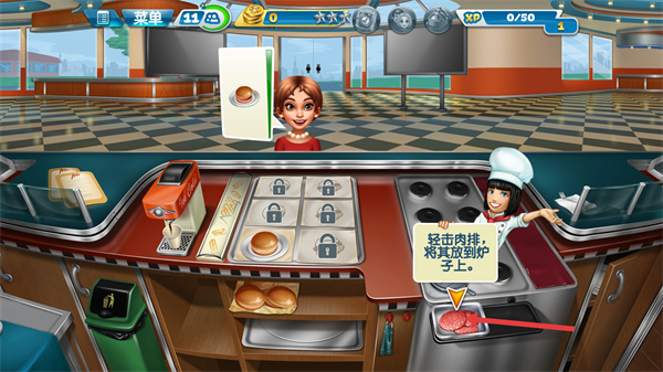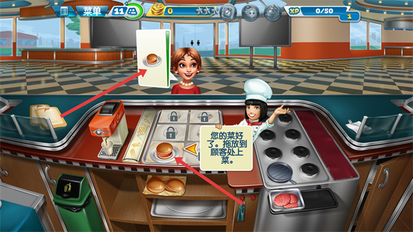 4、漢堡制作完畢后,將其拖放到顧客所在位置上菜,成功完成第一份訂單,同時可積累經驗和金幣以解鎖更多內容。