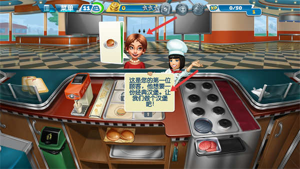 1、界面會提示迎來第一位顧客,該顧客想要經典漢堡,此時需按照指引開啟漢堡制作流程。
