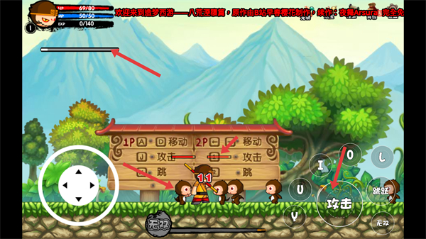 2、通過虛擬搖桿移動角色點擊攻擊按鈕攻擊敵人,留意操作說明掌握角色的移動和攻擊方式為戰斗做準備。