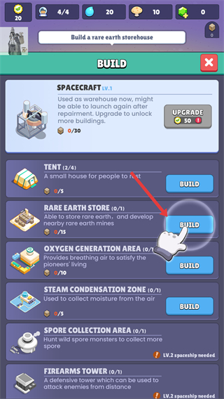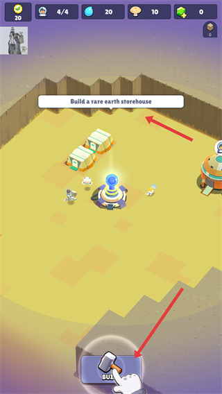 2、點擊建造按鈕開始建設稀土倉庫推進基地的設施建設,提升資源存儲和開發能力助力游戲進程。