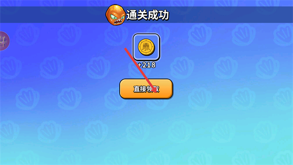 4、通關成功后,點擊直接領取,獲取218金幣獎勵,積累資源用于解鎖新武器、寵物或提升角色戰力,推動游戲進程。