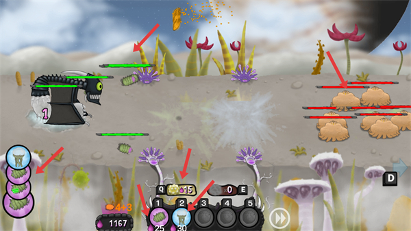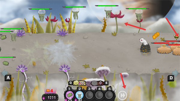 1、塔防設施系統包含十余種生物建筑,酸性噴塔對重型單位造成持續腐蝕,蛛網塔則能限制移動速度,根據敵人進攻路線預判布局。
