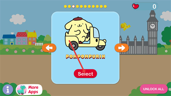 2、選擇角色如布丁狗,點擊Select,確定角色后進入游戲關卡,通過關卡,獲得獎勵。