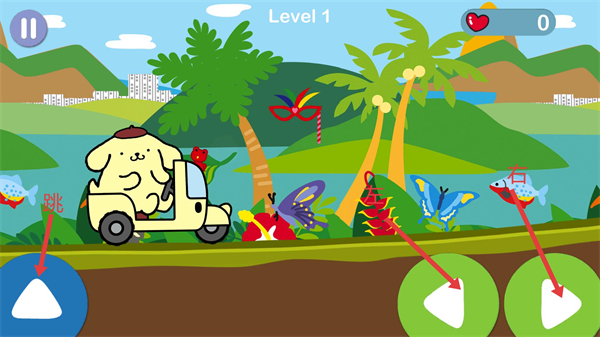 3、在Level1關卡中利用跳、左、右、按鈕操控角色駕駛車輛,收集道具和愛心,躲避障礙物,推進游戲進程。