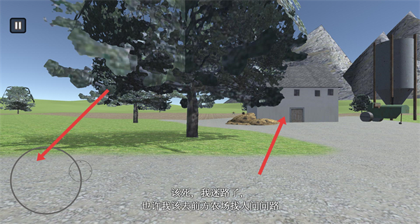 2、在戶外場景通過左下角虛擬搖桿控制移動按提示前往農場找人問路,沿著道路朝房屋行進途中留意環境細節。
