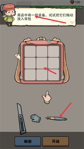 2、在商店中拖動裝備放入背包整理背包空間,獲取初始裝備為戰斗做好準備提升角色戰力。