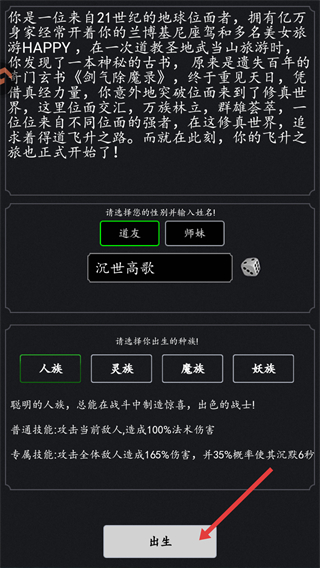 1、選擇性別輸入姓名選擇種族后人族點擊出生,創建角色開啟修真世界的飛升之旅熟悉角色創建流程。