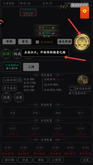 2、點擊挑戰開始強者之路參與戰斗提升修為和靈幣,熟悉戰斗系統推進游戲進程。