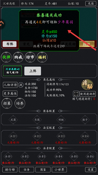 3、通關成功后獲取靈幣、修為、仙緣獎勵繼續挑戰關卡,積累資源提升角色實力朝著領取少年莫羽的目標前進。