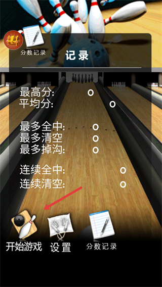 1、點擊開始游戲進入保齡球游戲界面,熟悉游戲的分數記錄和各項統計開啟保齡球挑戰之旅。