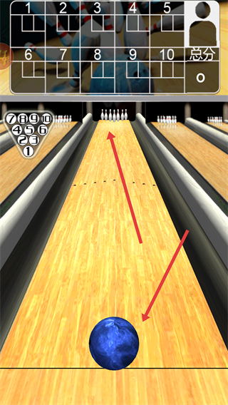2、控制藍色保齡球的滾動方向瞄準球瓶嘗試擊倒更多球瓶,提升游戲得分熟悉保齡球的操作技巧。
