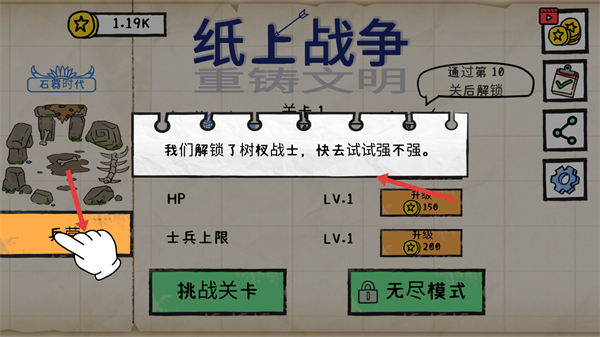 1、點擊兵營進入兵種配置界面熟悉新兵種樹杈戰士的使用,為戰斗做好兵種搭配準備提升軍隊戰力。