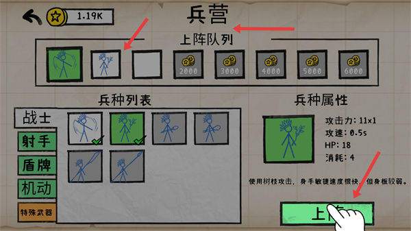 2、在兵營中調整上陣隊列選擇合適兵種點擊上陣,優化兵種配置為戰斗提供有力的兵力支持。