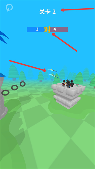 4、進入關卡2關注敵我兵力對比合理操控弓箭手射擊,利用兵力和射擊優勢擊敗敵人贏得關卡勝利。