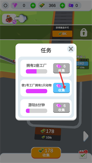 2、在任務界面中點擊使1號工廠擁有1只動物任務的收集按鈕,獲取鉆石獎勵。