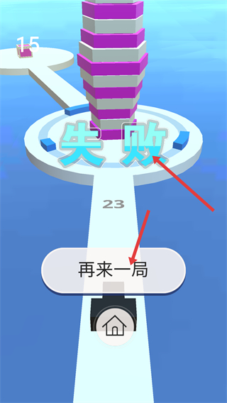 4、若游戲失敗點擊再來一局繼續挑戰熟悉游戲的重試機制,保持游戲的持續性提升游戲的通關能力。