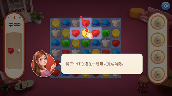 1、在消除關卡里將三個紅心連在一起完成消除,通過消除元素獲取積分,推進關卡進度。