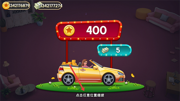 2、關卡結算時,點擊任意位置繼續游戲,可獲取400金幣和5現金獎勵,用于后續家具購買與房屋裝修。