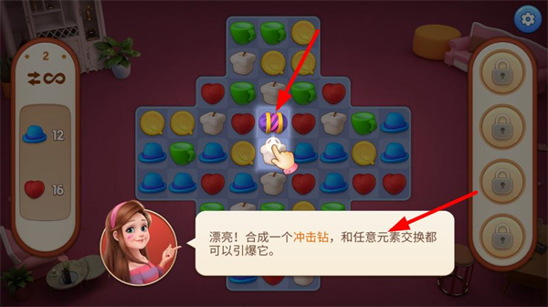 1、參與消除玩法,合成沖擊鉆,它可與任意元素交換并引爆,完成消除操作積累資源,助力后續家居裝扮。