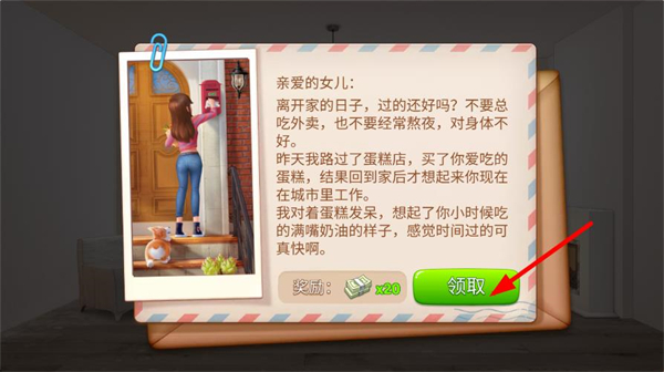 2、查看信件內容后點擊領取按鈕,獲取對應的金幣獎勵,這些金幣可用于解鎖家居物品,推進裝扮進程。