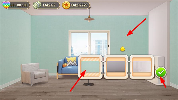 3、選擇喜歡的家居樣式,比如墻面裝飾元素,挑選后點擊對勾確認,將其應用到房間里提升美觀度。