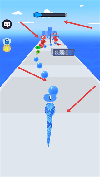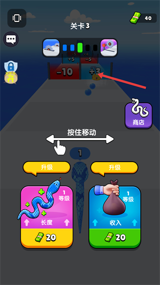 4、進入關卡3后按住移動按鈕操控角色收集藍色球體和增益道具,同時避開減益區域可升級角色長度或收入助力關卡挑戰。