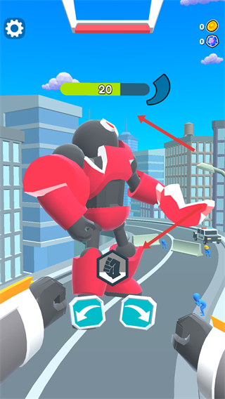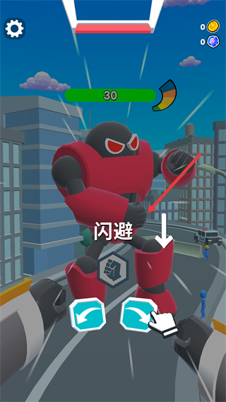 1、戰斗時根據提示點擊閃避按鈕躲避紅色機器人的攻擊,避免受到傷害為后續反擊創造機會。