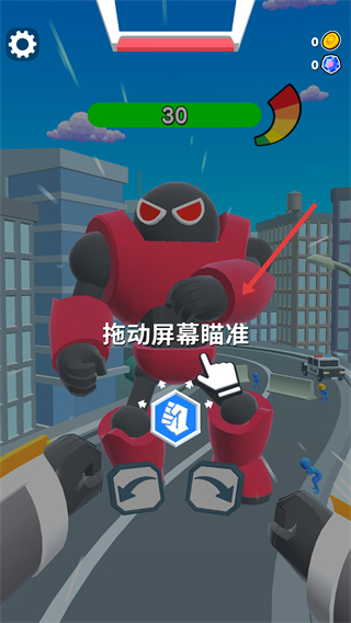 2、閃避后拖動屏幕瞄準紅色機器人找準攻擊時機發起反擊,逐步削減其生命值推進戰斗進程。