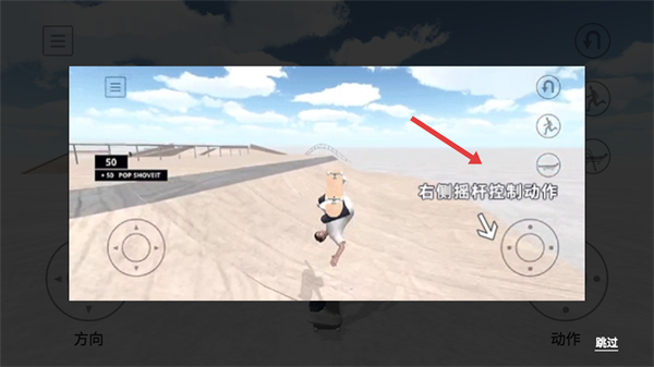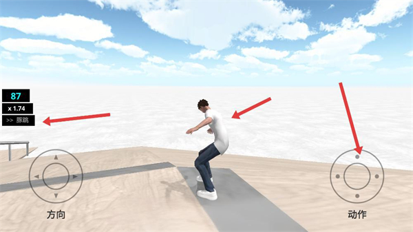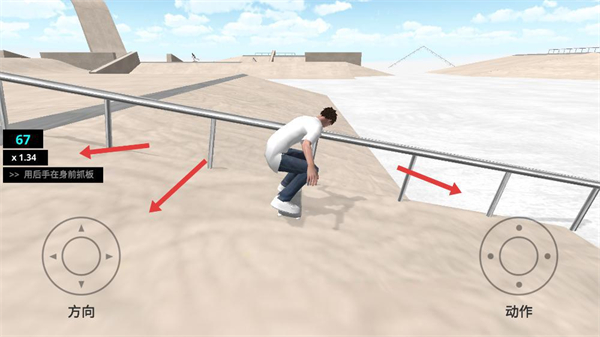 2、滑行時留意左側的分數和動作提示利用方向搖桿控制滑行方向,在欄桿等障礙物處完成特技動作積累分數。