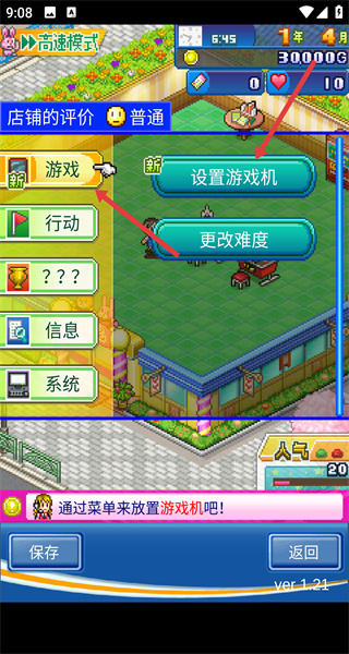 2、在游戲界面中找到游戲菜單,點擊進入后選擇設置游戲機選項,以此來為游戲廳添置各類游戲機設備。
