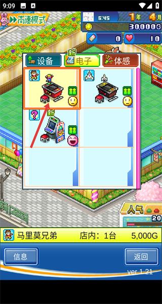 3、進入設置游戲機的設備列表后,挑選心儀的游戲機,如馬里莫兄弟這類,準備將其放置到游戲廳內。