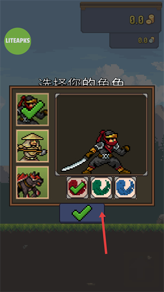 1、在角色選擇界面挑選心儀的角色如忍者,選擇后點擊綠色對勾確認即可進入游戲開始冒險。