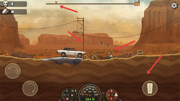 1、駕駛車輛時關注上方進度條利用加速按鈕控制車速,避開電線桿等障礙物撞擊僵尸獲取分數同時收集資源。
