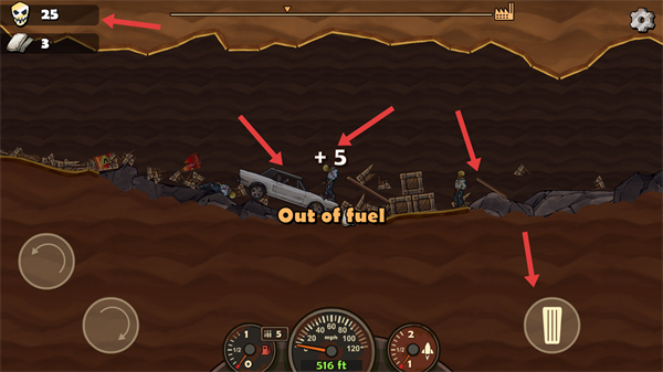 2、行駛中注意燃油消耗燃油耗盡前盡量多撞擊僵尸積累分數,遇到復雜地形時合理調整車速避免車輛停滯。