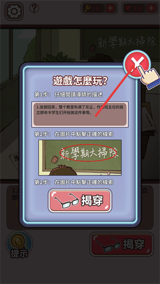 3、在關卡中找到劇情提示的新學期大掃除線索,點擊揭穿按鈕,推進關卡進度。