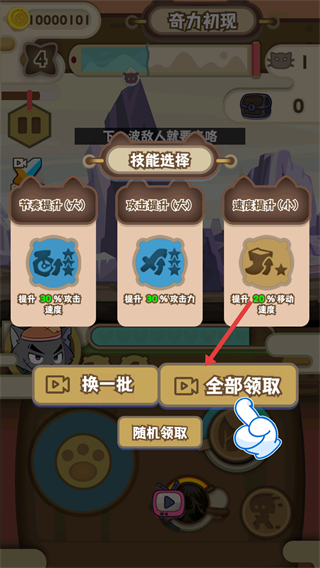 4、技能選擇時可根據需求選擇節奏、攻擊或速度提升技能點擊全部領取可獲得所有技能助力后續戰斗。