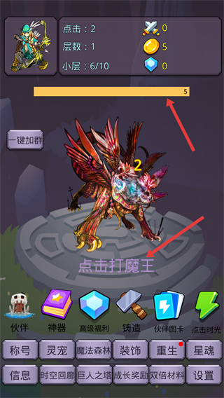 1、點擊打魔王通過不斷點擊攻擊魔王推進層數和小層進度,獲取金幣等資源提升角色實力。