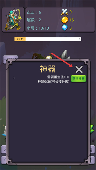 3、在神器界面當重生值達到100時可獲得神器,神器可長按升級提升角色屬性增強戰斗能力。