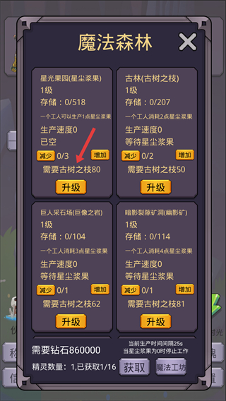 4、進入魔法森林界面收集古樹之枝等資源升級星光果園、古林等建筑提升資源生產速度助力游戲進程。