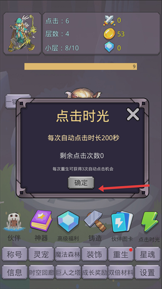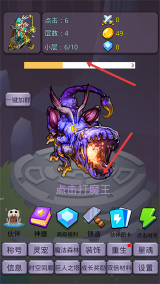1、點擊打魔王通過持續點擊推進層數和小層進度獲取金幣資源,提升角色戰力不斷挑戰更高層數。