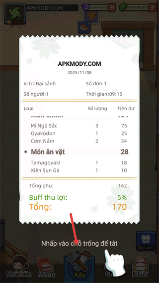 4、訂單完成后,點擊空白處關閉賬單界面,結算收益如該賬單總金額170,含餐品費用,繼續接待新顧客。