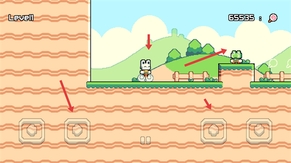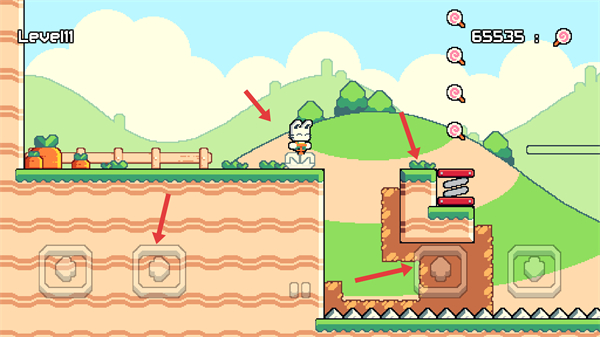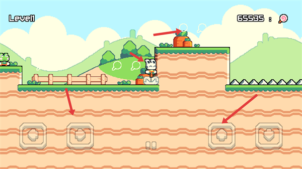 3、繼續在Level1中前進遇到高處時合理跳躍,同時留意收集胡蘿卜等物品利用控制按鈕調整角色位置推進關卡進度。