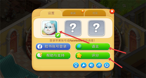 1、進入設置界面可通過臉書登錄保存進度,點擊頭像旁箭頭能關聯賬號還能設置語言尋求幫助或給游戲評分。