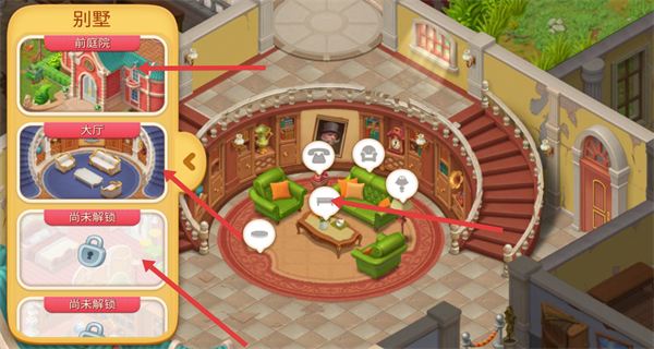 3、別墅界面左側有不同區域,點擊前庭院大廳可切換場景,完成任務解鎖新區域打造多樣家園空間。