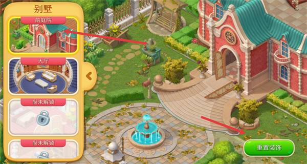 4、切換到前庭院場景,若對裝飾不滿意點擊右下角重置裝飾可重新布置庭院煥新家園外觀。