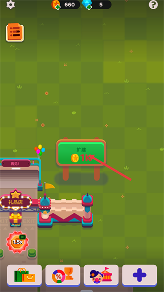1、點擊擴建標識,消耗金幣拓展游樂場區域,為新增設施或裝飾騰出空間。