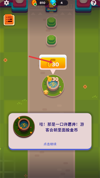 3、收取許愿井的30金幣收益,許愿井是游客投幣的設施,可持續為游樂場帶來金幣收入。