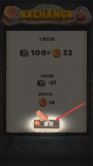 4、出售垃圾后點擊拿取按鈕,獲取金錢獎勵,積累資金用于后續建筑升級或資源購買推進游戲進度。