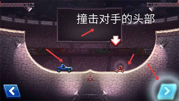 2、在對戰中操控車輛撞擊對手的頭部,利用左右方向鍵調整位置精準攻擊以擊敗對手。